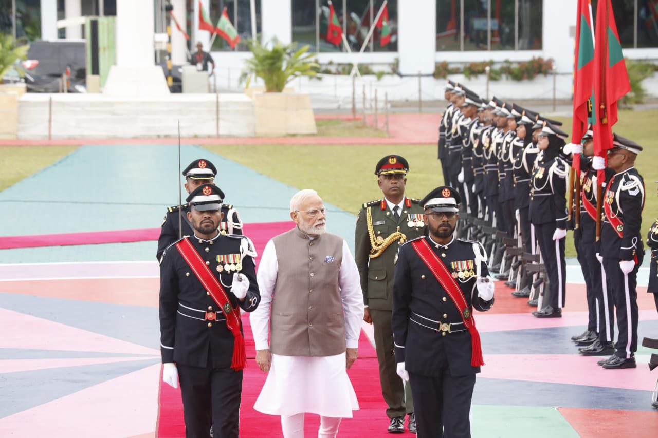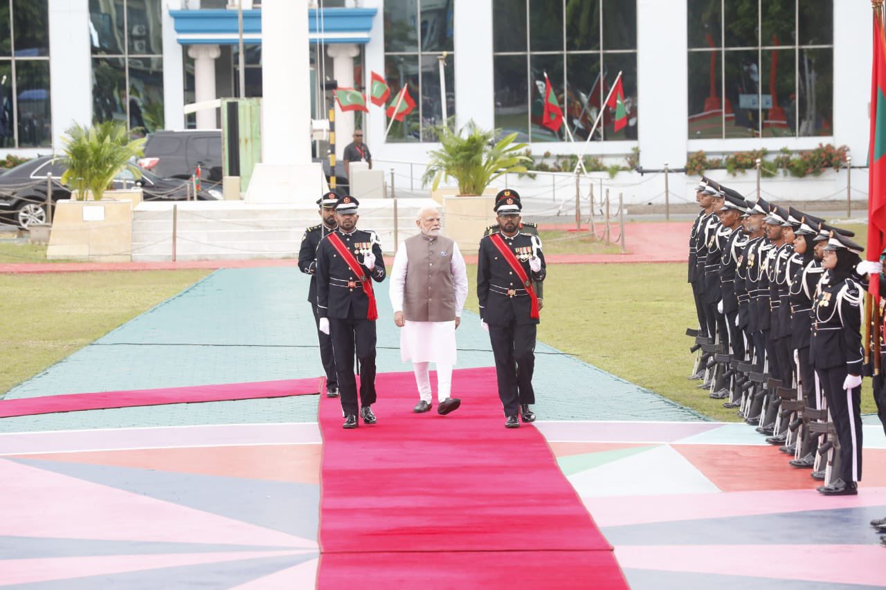 ޖުމްހޫރީ މައިދާނުގައި ބޭއްވި ހަރަކާތްތައް ބައްލަވާލެއްވުމަށް ފަހު، މައިދާނުން ފެށިގެން ރައީސް އޮފީހާ ހަމައަށް މޯދީ ވަޑައިގަތީ ހަތްކޮޅުގައި ރަސްމީ އިއްޒަތުގައި، ބެރު ދުންމާރި ތާޅަފިލީގައި ހެވިކަމުގެ ލަޝްކަރީންނާ އެކުގައެވެ.
