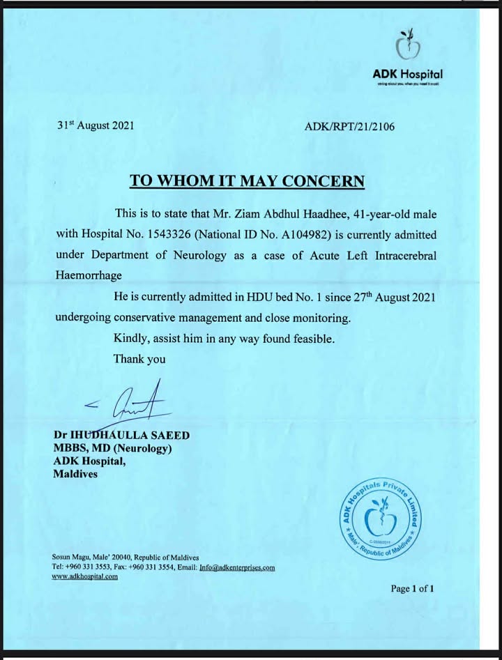 އަދި މިފަރުވާ އަށް އެތައް ބައެއްގެ ދީލަތި އެހީ ބޭނުންވާނެއެވެ. އާސަންދަ އެހީދެނީ ހަމައެކަނި ބޭހަށެވެ. ބޭސްސިޓީގައި ހުންނަ ބޭހަށެވެ. ހުރުމާއި ކެއުމާއި ދަތުރު، އެހީތެރިޔާގެ ހަރަދު މިއިން ކަންކަމަށް ނޫނެވެ. އެންސްޕާ ދެނީ މިކަމަށް ޓިކެޓެވެ.. ބާކީ ކަންކަން ހަމަޖައްސާނެ ގޮތެއް ނެތް މީހެއްނަމަ އެދެނީ އާންމުންގެ އެހީއަށެވެ، ޒިއާމްގެ ހާލަތުވެސް މިއަދު ހުއްޓިފައި އެހެރީ އެހިސާބުގައެވެ. އެހީއަށް އެދެނީ އިންތިހާއަށް އާދޭހާއެކުގައެވެ.