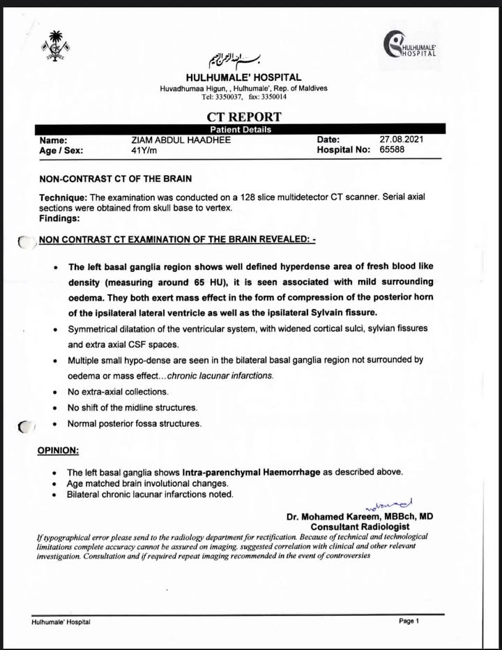 2021 އޮގަސްޓް 27 ވަނަ ދުވަހުގެ ހަވީރު، ޑިއުޓީއަށް ދިއުމަށް ޔުނިފޯމް ލައިގެން ތައްޔާރު ވަމުން ދަނިކޮށް ކުރިމަތިވި ސްޓްރޯކްގެ ސަބަބުން، އެންމެ 15 މިނެޓްތެރޭގައި ހުޅުމާލެ ހޮސްޕިޓަލަށް ގެންދެވުނު ޒިއާމްގެ ހާލަތު ވަނީ ސީރިއަސްވެފައެވެ. އޭގެފަހުން އޭ.ޑީ.ކޭ ހޮސްޕިޓަލަށް ބަދަލުކުރެވި، އައި.ސީ.ޔޫގައި އެއް ހަފްތާ ހޭދަކުރުމަށްފަހު، ސްޕެޝަލް ވޯޑުގައި ދެ މަހާ ގާތަށް އެނދުމަތިވެފައި އޮތެވެ.