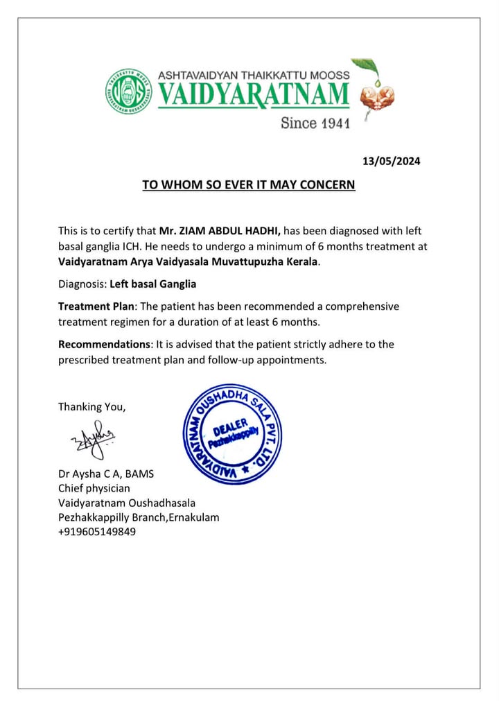 މިވަގުތު ޒިއާމްގެ އެންމެ ބޮޑު އެހީތެރިއަކީ އޭނާގެ މަންމައެވެ. އެހެން ގާތްތިމާގެ މީހުންގެ އެހީތެރިކަމެއް ނެތް ހާލުގައި، މަންމަ އެކަނި ދަނީ އޭނާއަށް ޚިދުމަތް ކުރަމުންނެވެ. ޑޮކްޓަރުންގެ ލަފާގައި އިތުރު 6 މަސްދުވަހުގެ ފަރުވާއެއް އިންޑިއާގައި ކުރަން ޖެހޭކަމަށް ބުނެފައިވާއިރު، ޒިއާމަށް މިވަނީ މާލީ ގޮތުން ދަތިތަކާ ކުރިމަތިލާންޖެހިފައެވެ. އާއިލާއިން އެހީތެރިވާންވެސް އަޅާލަންވެސް އިނީ އުމުރުން ދުވަސްވެފައި އިން ބަލި މަންމައެކެވެ. ދެން ހެޔޮ އެދޭ ރައްޓެއްސެއް ނޫނީ ޒިއާމްގެ ދެން ތިބީ ކުޑަ 3 ކުދިންނެވެ. އެކުދިންނަކަށް ޒިއާމްގެ ބޭސްފަރުވާއަށް އަދި އެއްވެސް ކަމެއް ކޮށްދެވޭކަށް ނޯންނާނެތާއެވެ.