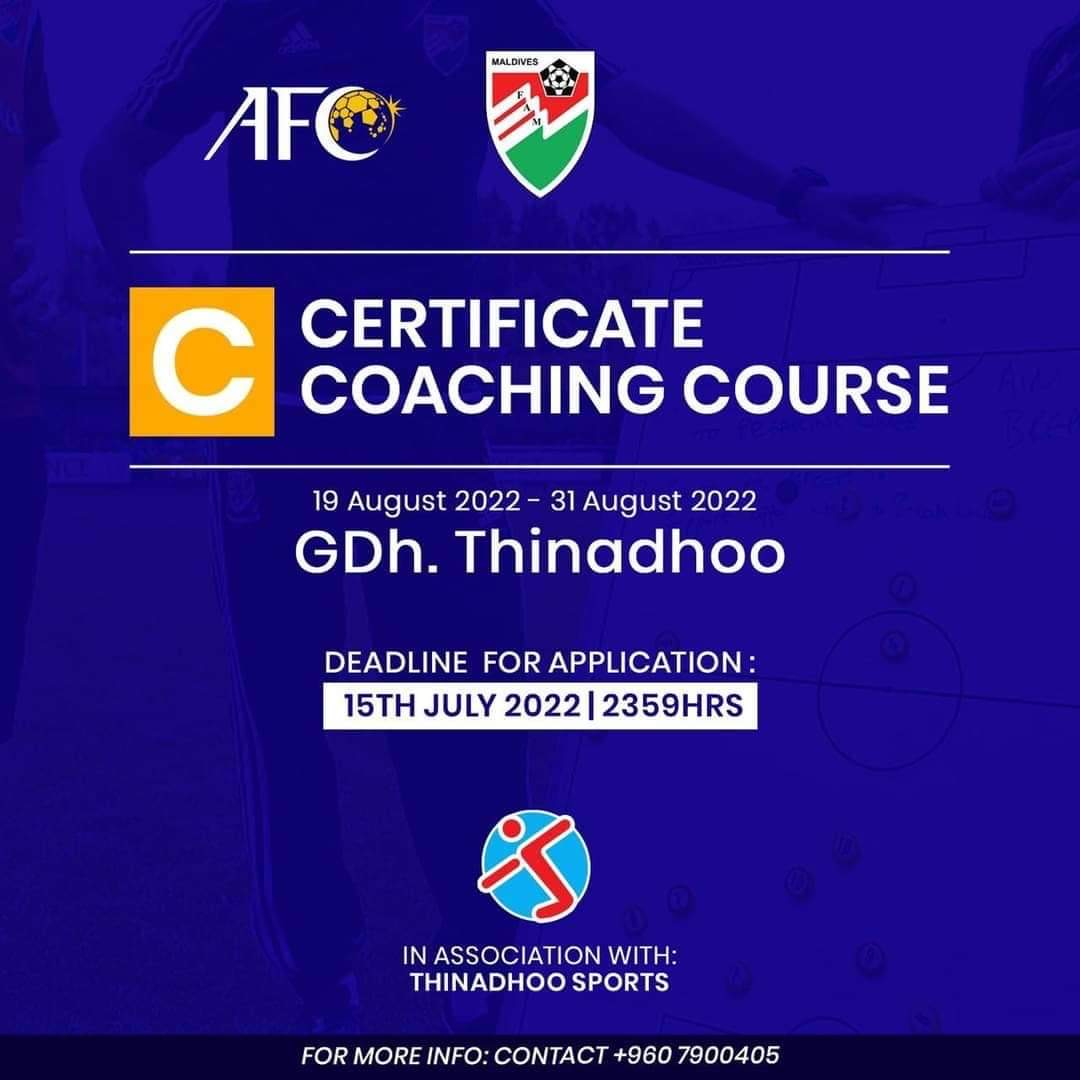 ފުޓްބޯޅަ އެސޯސިއޭޝަން އޮފް މޯލްޑިވްސް އާއި ތިނަދޫ ސްޕޯޓްސް ގުޅިގެން، 19 އޮގަސްޓް 2022 ން 31 އޮގަސްޓް 2022 ގެ ނިޔަލައް ތިނަދޫގައި ބޭއްވުމައް ހަމަޖެހިފައިވާ އޭއެފްސީ “ސީ” ސެޓްފިކެޓް ކޯޗިން ކޯހުގައި ބައިވެރިވުމުގެ ފުރުސަތު ހުޅުވާލައިފިއެވެ.