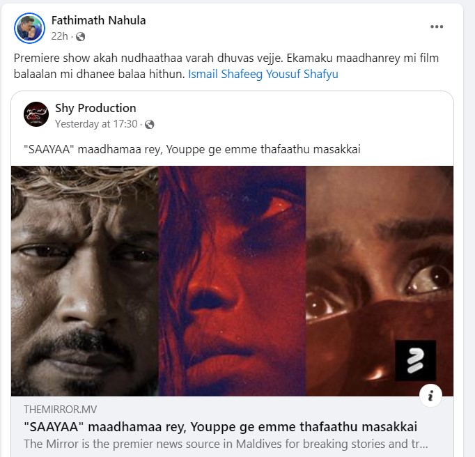 “ޕްރިމިއަރ ޝޯއަކަށް ނުދާތާ ވަރަށް ދުވަސްވެއްޖެ. އެކަމަކު މާދަމާރޭ މި ފިލްމު ބަލާލަން މި ދަނީ ބަލާ ހިތުން.” ނަހުލާގެ އެފްބީ ޕޯސްޓުގައި ބުނެފައިވެއެވެ.