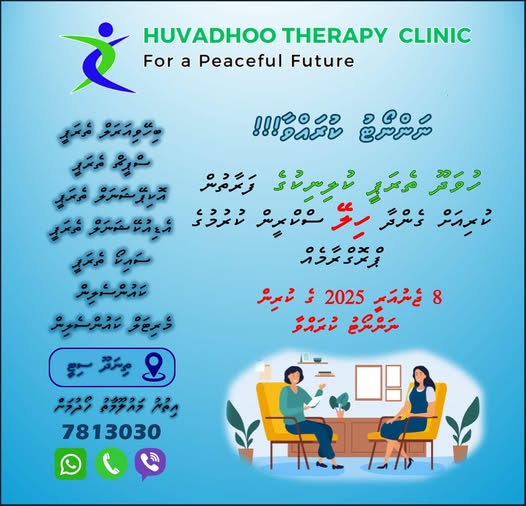 އިތުރު މަޢުލޫމާތު ހޯއްދެވުމަށް 7833003 އަށް ގުޅުއްވުމަށް ކްލިނިކުން އެދިފައިވެއެވެ. މި ޕްރޮގްރާމަކީ ހުވަދޫ ތެރަޕީ ކްލިނިކް – ފޯރ އަ ޕީސްފުލް ފިއުޗަރ އިން ހިންގާ ޕްރޮގްރާމެކެވެ.