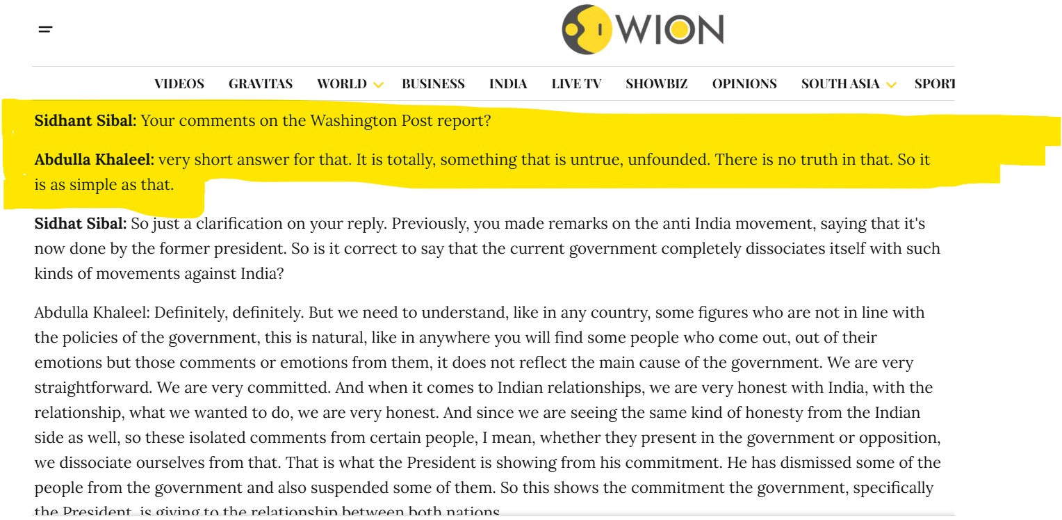 އިންޑިއާގެ ނޫހެއް ކަމުގައިވާ “ވިއޮން” (WION)އަށް ދެއްވި ބަސްދީގަތުމެއްގައި، ޚާރިޖީ ވަޒީރު ޑރ. ޢަބްދުﷲ ޚަލީލް ވިދާޅުވެފައިވަނީ ވޮޝިންގްޓަން ޕޯސްޓުގެ ރިޕޯޓަކީ “އެކަމަށް ވަރަށް ކުރު ޖަވާބެއް، އެއީ މުޅިން ވެސް ހަގީގަތާ ހިލާފު، އަސްލެއް ނެތް ވާހަކަތަކެއް. އެކަމުގައި އެއްވެސް ހަގީގަތެއް ނެތް.”  ކަމަށް ވެސް އެމަނިކުފާނު ވިދާޅުވިއެވެ.